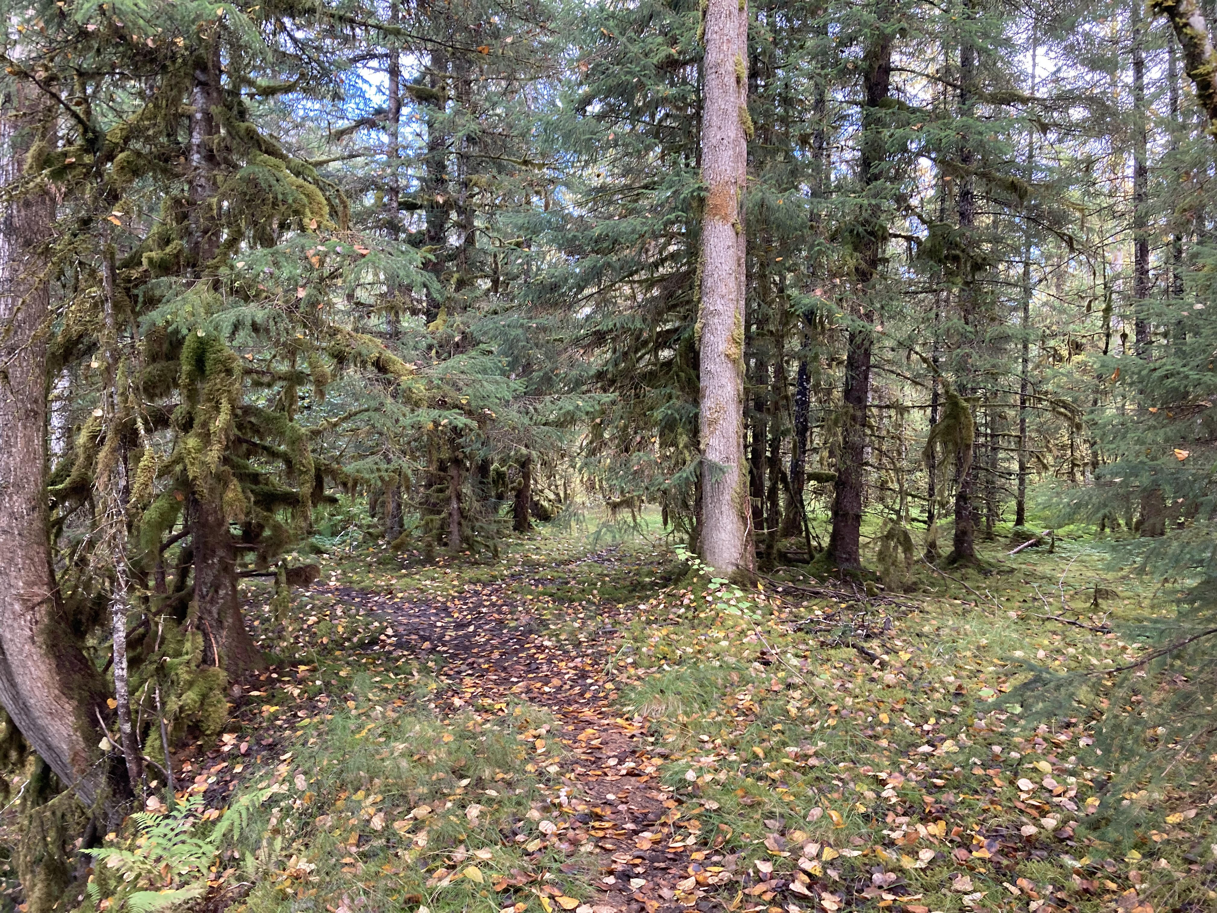 There’s the trail, just as I’d left it, through stands of alder and up a single-lane logging road recolonized by hip-tall hemlocks. I follow the steady incline under fallen trees and around puddles. A smattering of fish cut from plywood marks the trail with engraved names like “Bobby ‘Sparkplug’ Joseph” that demand exposition.