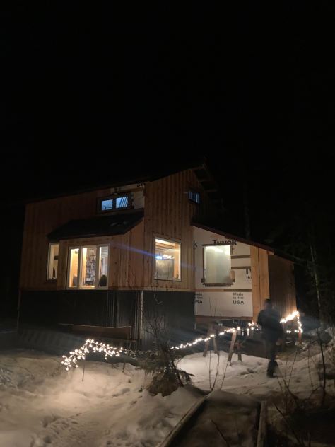 Breanna and I ping-pong between the cabin, shabin, and fire pit, toting folding tables, food, and tequila. I don’t remember what year the ‘Wassail’ tradition began in the Good River neighborhood. In essence, jolly residents travel from house to house for cocktails and food to celebrate the winter solstice and the promise of returning daylight. It’s the closest we get to a bar crawl around here. The tradition has steadily grown as friends from other Gustavus Neighborhoods make the pilgrimage down our meandering roads that this year are covered in an inch of ice.