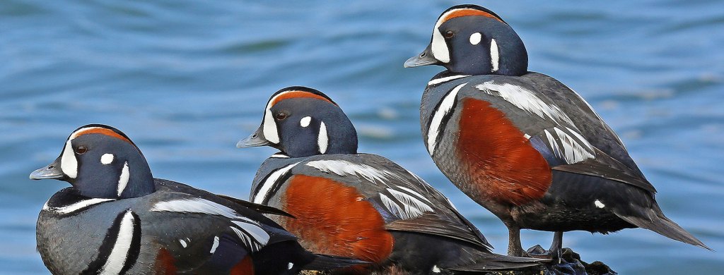 Harlequin ducks squeak in protest as I paddle by. They take to the water, necks bobbing forward and back as if to give themselves the illusion of more speed. Their rubber ducky chatter conceals their daredevil hobby of surfing southeasterly waves seconds before they break on the rocks. They dive like seals and fly like puffins, frantically beating their wings centimeters above the water. Every tidal rock holds another cluster of them, chattering away and admonishing the yellow kayak gliding past.