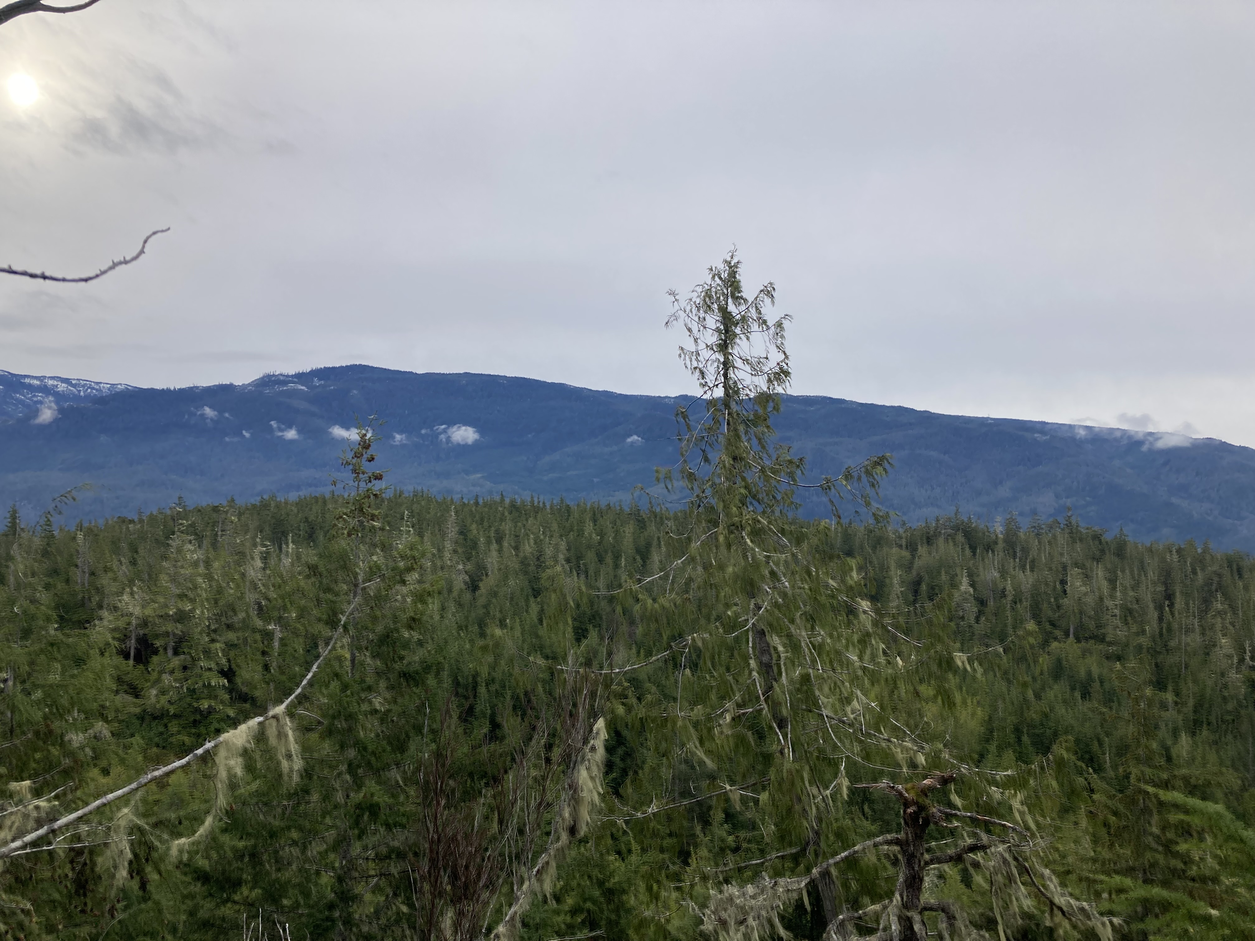 I’d be lost without my phone. It’s hard to admit, even by myself, without so much as a raven to judge me. The salal thicket blindfolded me, the small drainage spun me, and the few windows of sky reveal nothing. I follow the crutch in my hand, allowing it to guide me up one more embankment. A trio of big cedars with intertwined limbs shade a clearing festooned with deer beds. I push through one more wall of salal and gaze from the summit at Vancouver Island’s distant ridges. The hillside steepens, leaving just enough room for a viewshed and a clearing of rocks and lichen. I squeeze fatigued legs to my chest and stare at undulating greens and blues.